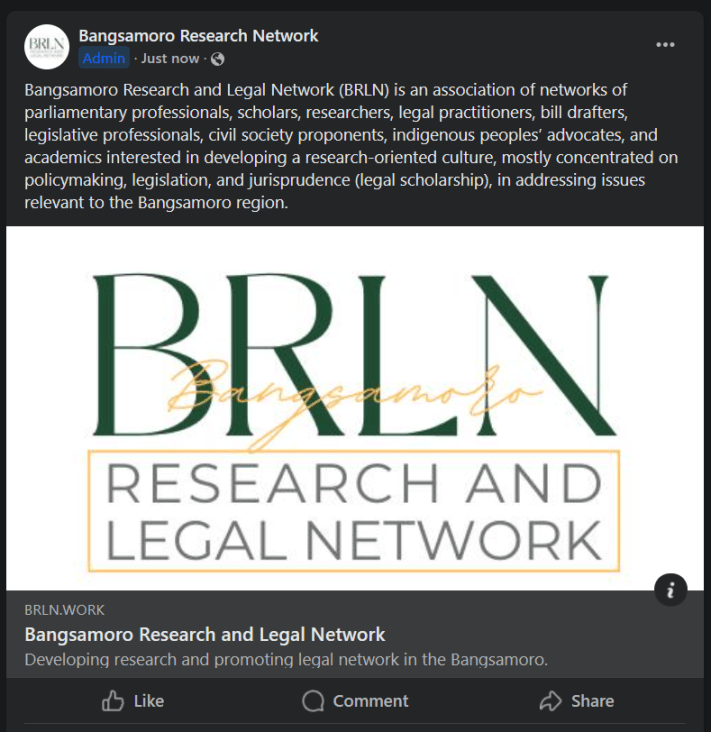 Bangsamoro Research and Legal Network (BRLN) is an association of networks of parliamentary professionals, scholars, researchers, legal practitioners, bill drafters, legislative professionals, civil society proponents, indigenous peoples’ advocates, and academics interested in developing a research-oriented culture, mostly concentrated on policymaking, legislation, and jurisprudence (legal scholarship), in addressing issues relevant to the Bangsamoro region.